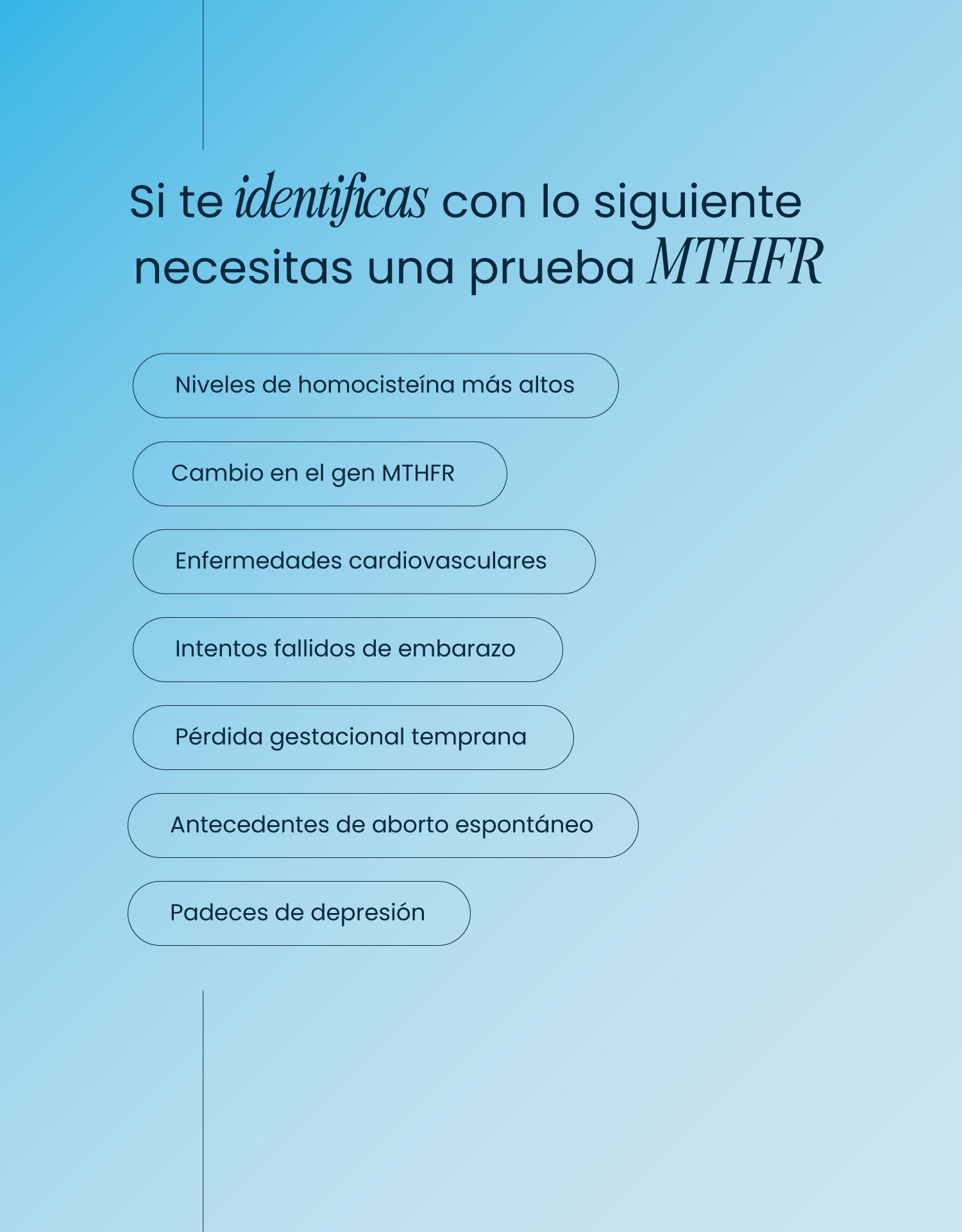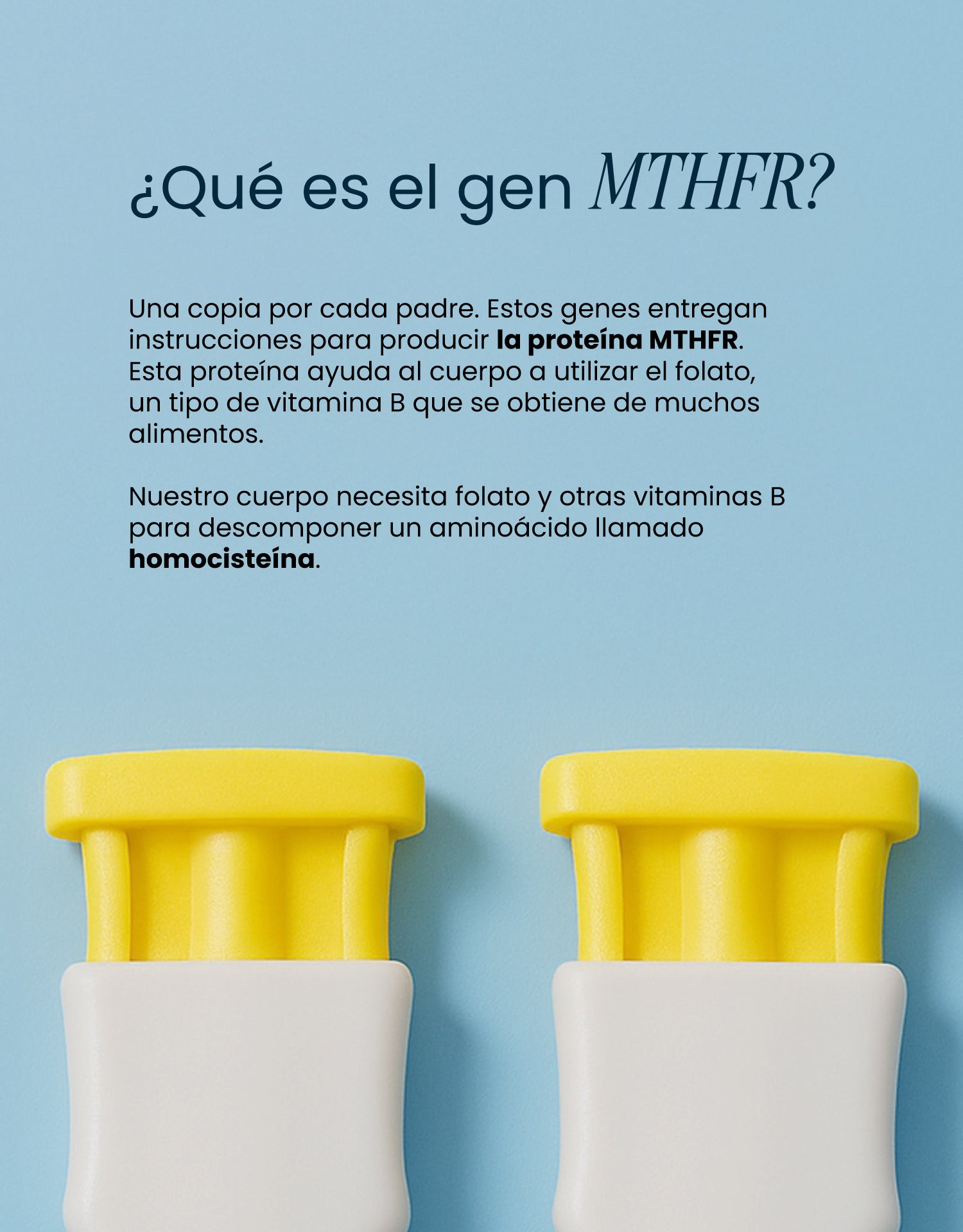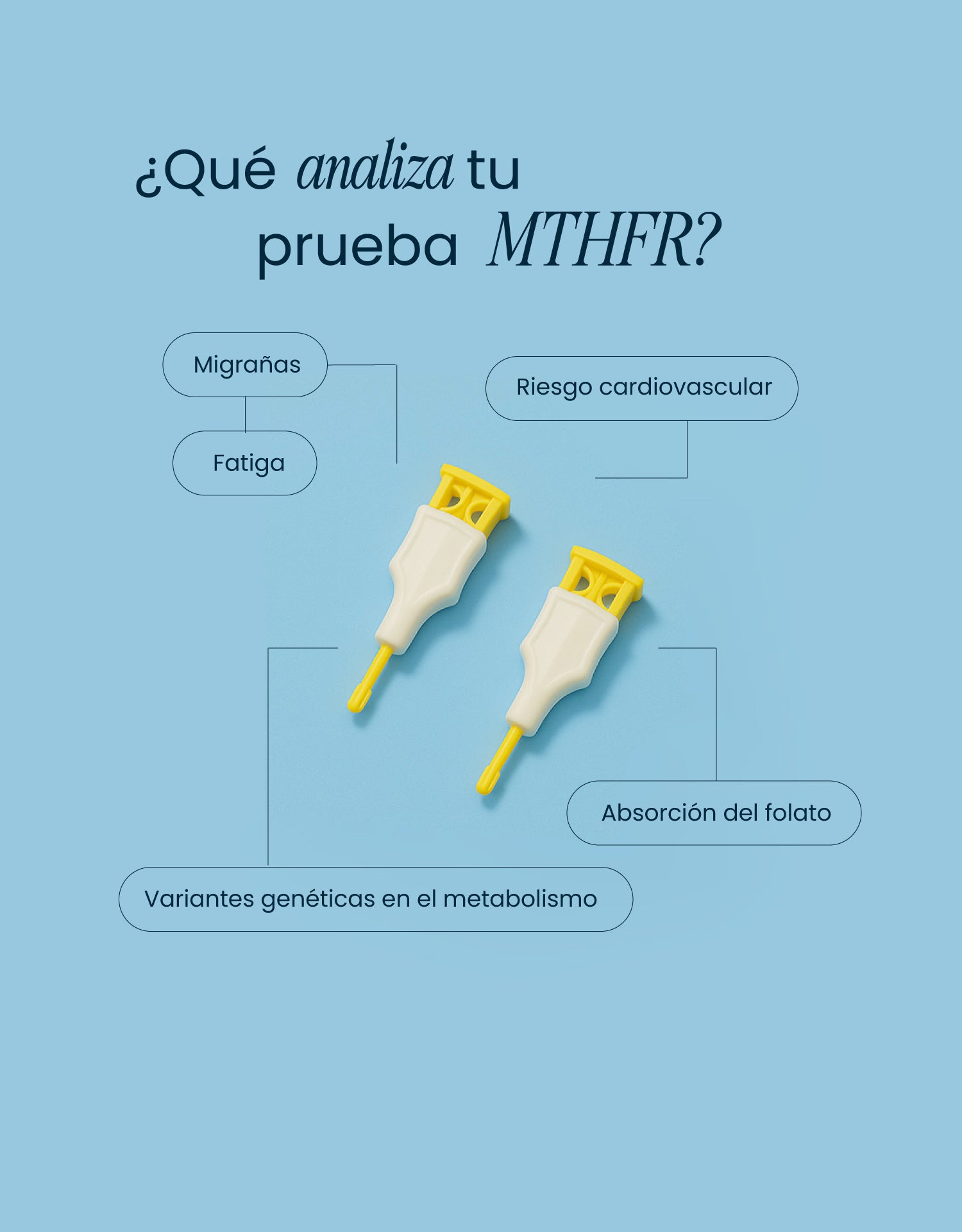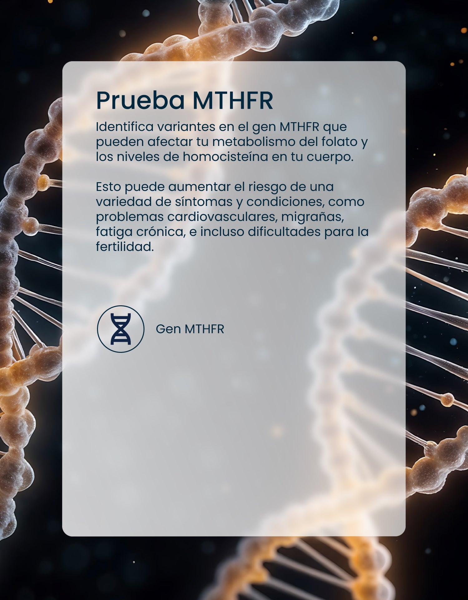 El Test MTHFR analiza si tienes variantes genéticas que afectan la manera en que tu cuerpo metaboliza el folato y regula los niveles de homocisteína. Estas variantes pueden estar relacionadas con síntomas como fatiga crónica, migrañas, problemas cardiovasculares, infertilidad o depresión.