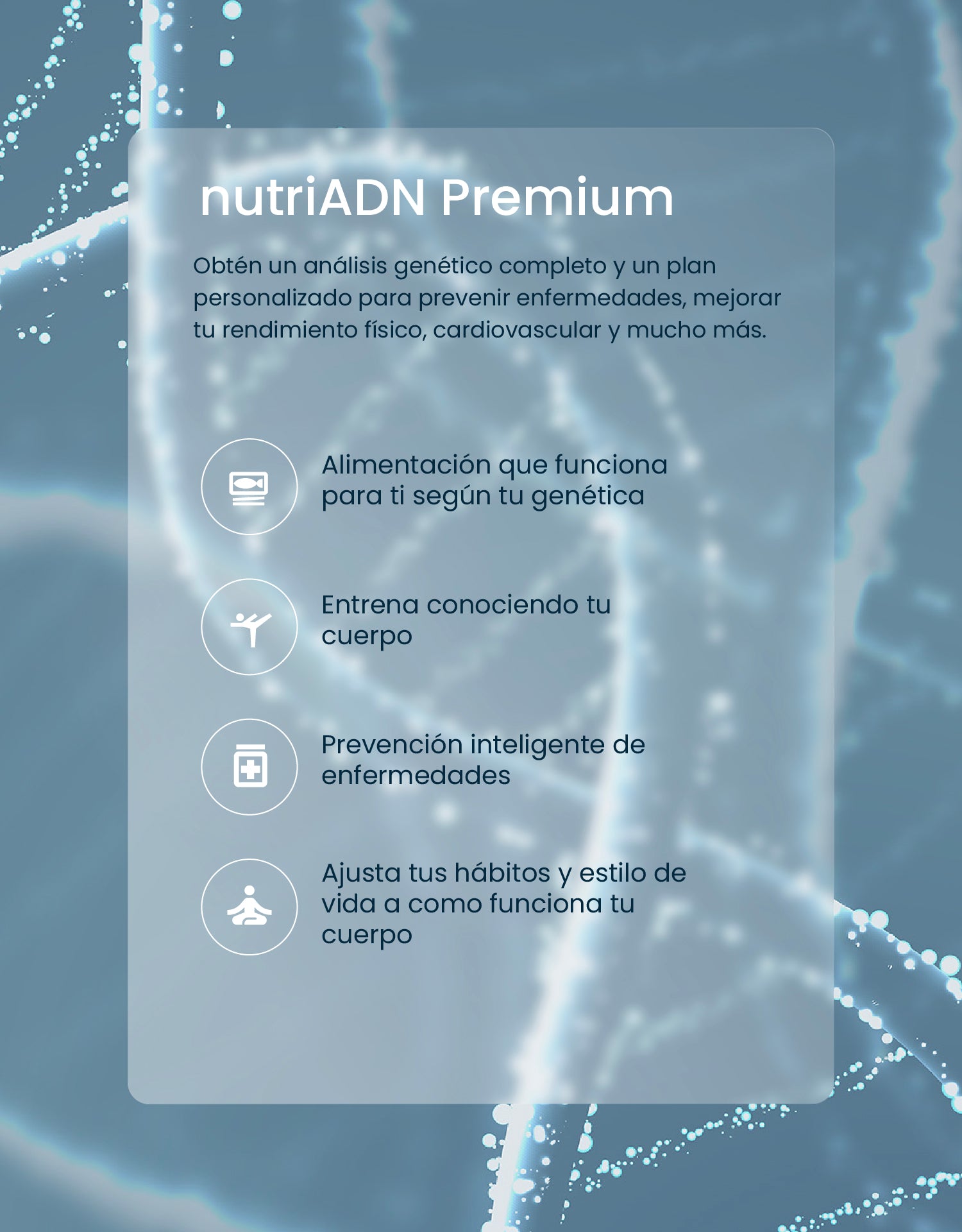 Lleva tu personalización al máximo con un análisis de genoma completo para transformar tu nutrición, entrenamiento, descanso y cuidado integral.