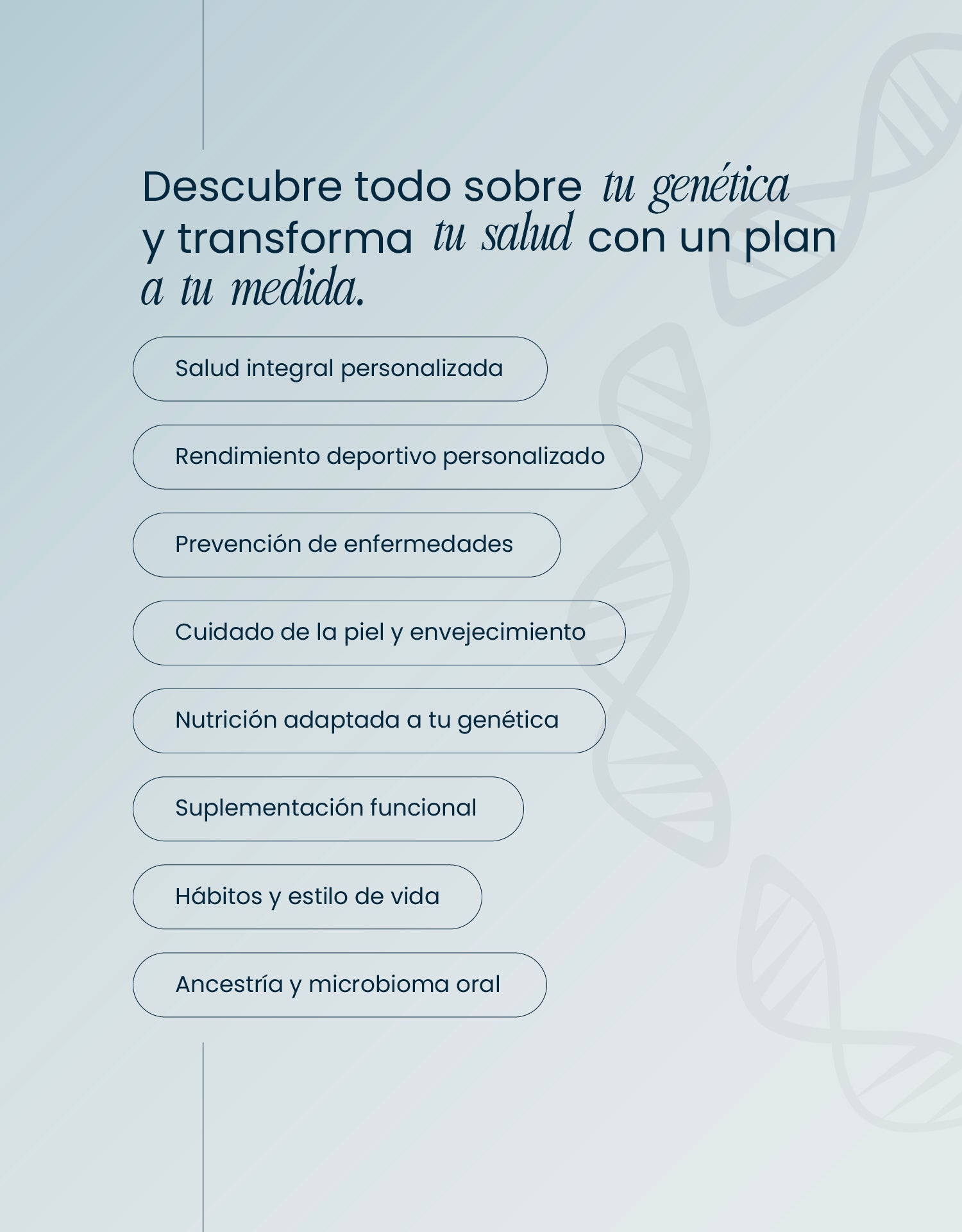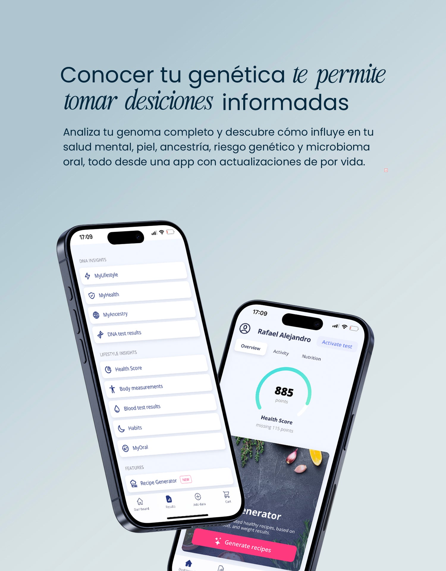 Integra módulos exclusivos: salud mental, piel y envejecimiento, riesgo poligénico de enfermedades, ancestría y rasgos.